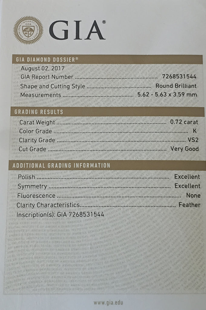 1 x GIA Certified Round Brilliant Cut Diamond of 0.72cts K VS2