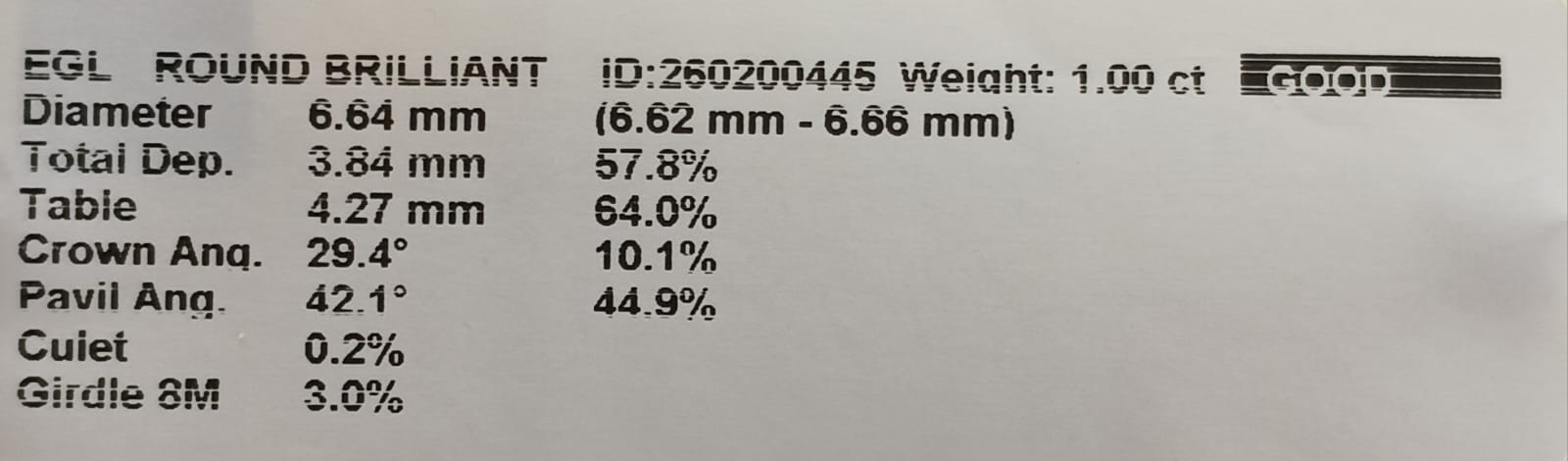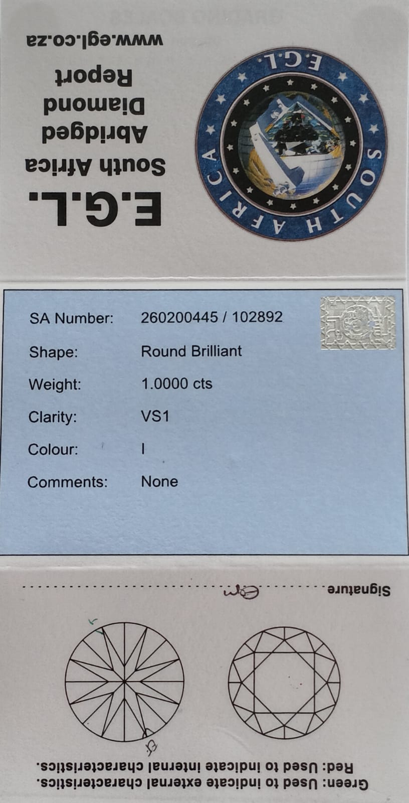 Round Brilliant Cut Diamond. 1.0000cts VS1 I