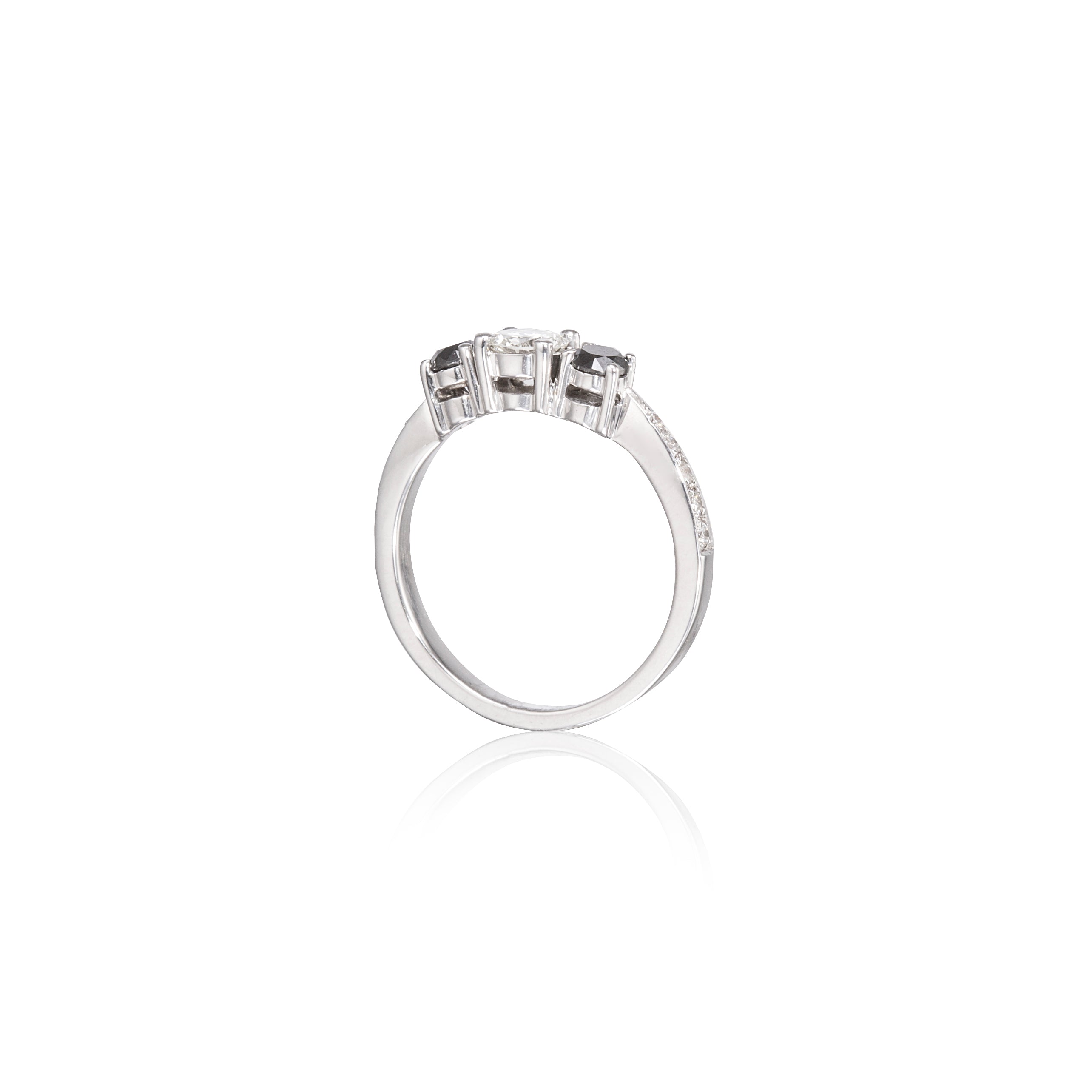9ct White Gold Black and White Diamond Trilogy Ring set with: Center: 1 x Round Brilliant Cut Diamond of approx. 0.22cts G/H VS- SI Sides: 2 x Round Brilliant Cut Black Diamonds each approx. 0.10cts 12 x Round Brilliant Cut Diamonds each approx. 0.005-0.01cts G/H SI |