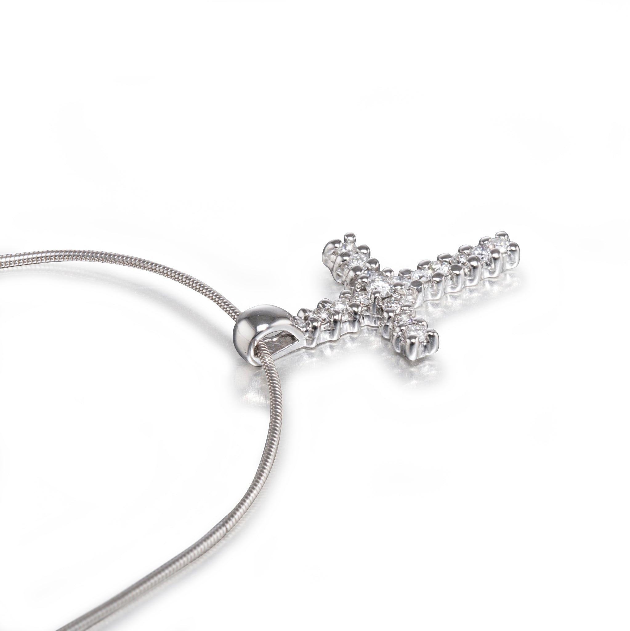 18ct White Gold Cross Diamond Pendant with a Snake Chain set with: 1 x Round Brilliant Cut Diamond of approx. 0.02cts G/H VS 15 x Round Brilliant Cut Diamonds each approx. 0.015cts G/H VS |