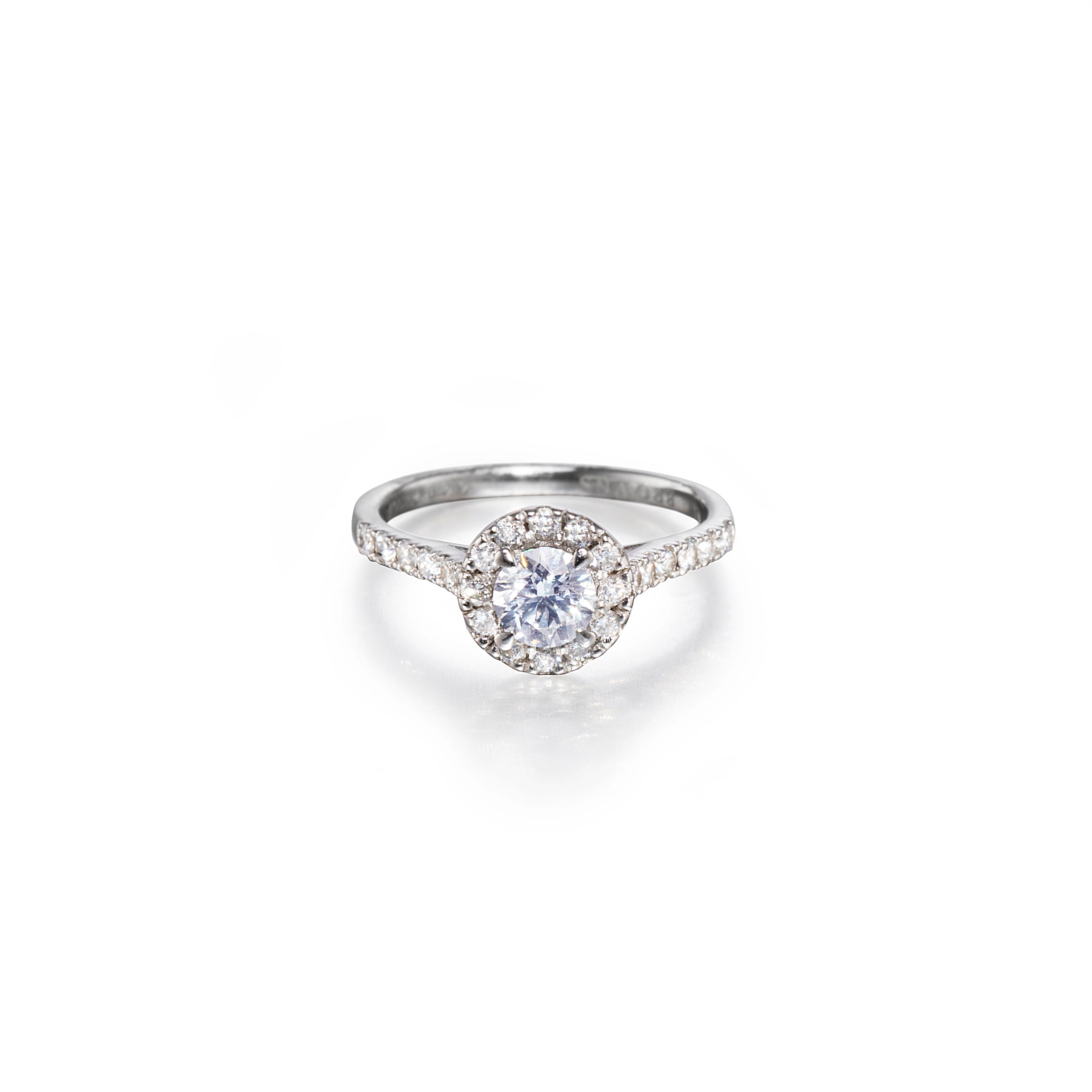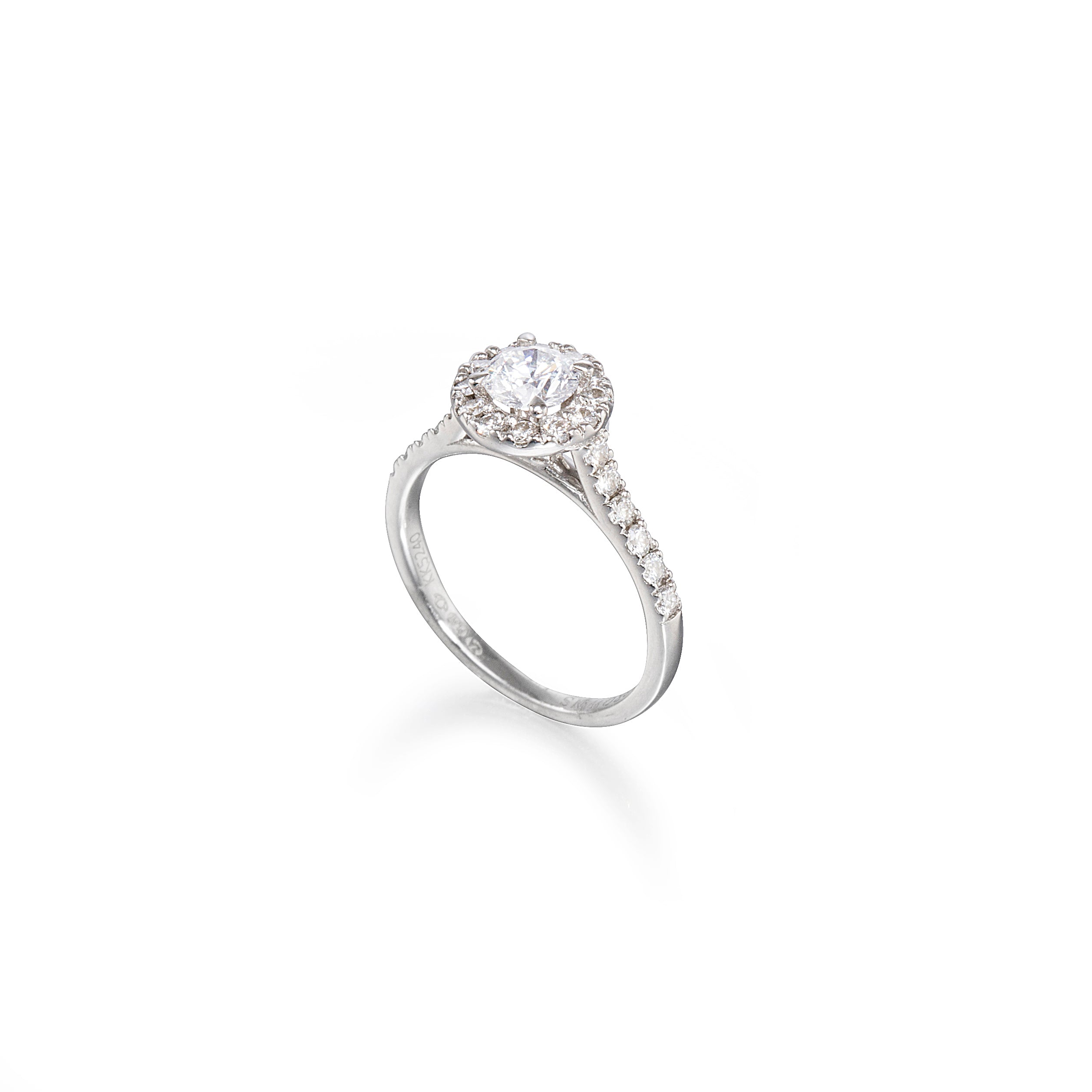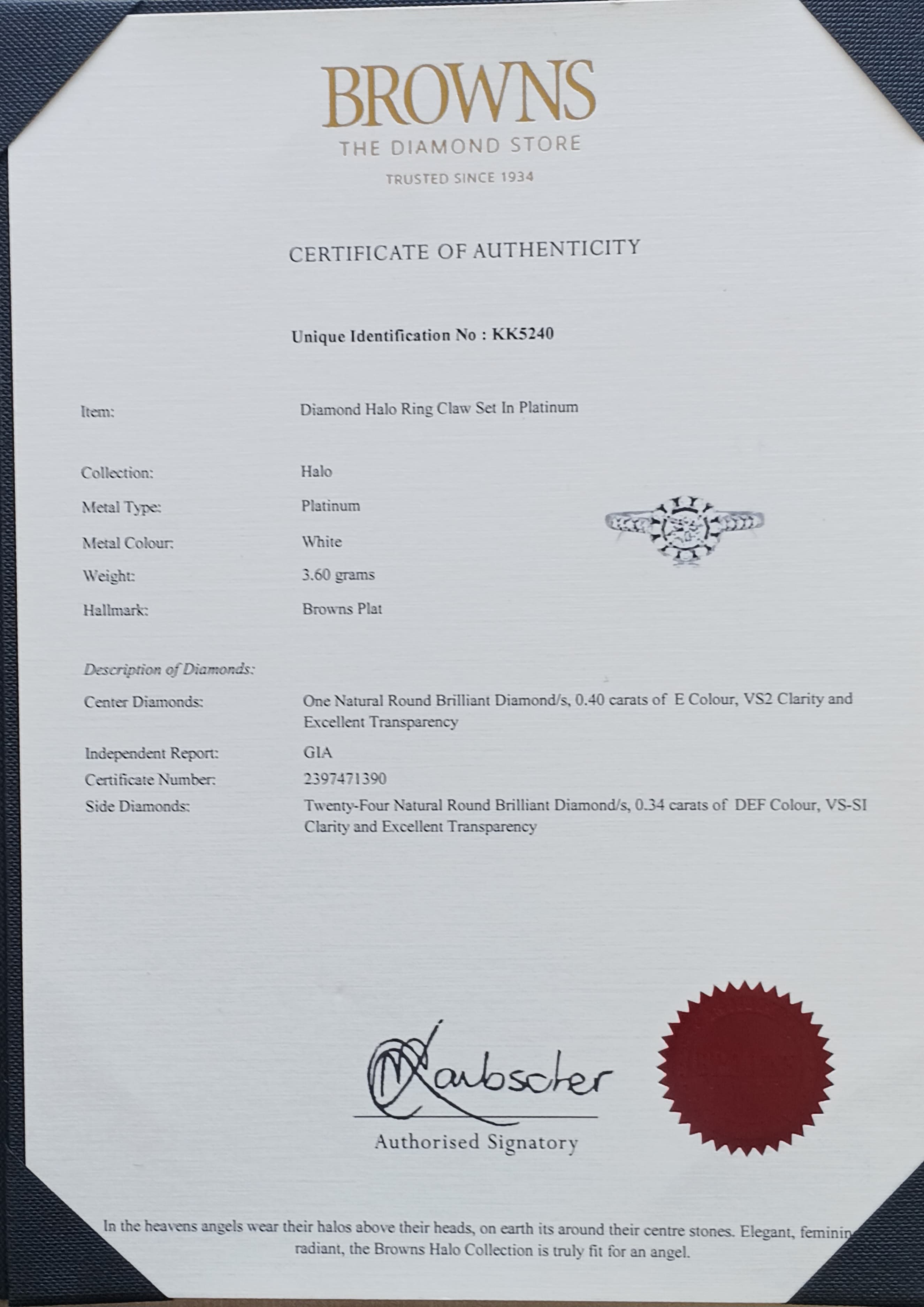 Browns Platinum Diamond Halo Claw set Ring set with: Center: 1 x GIA Certified Round Brilliant Cut Diamond of 0.40cts E VS2 GIA Report Number: 2397471390 Halo 12 x Round Brilliant Cut Diamond each approx. 0.015cts DEF VS-SI Sides: 12 x Round Brilliant Cut Diamonds each approx. 0.015cts DEF VS-SI |