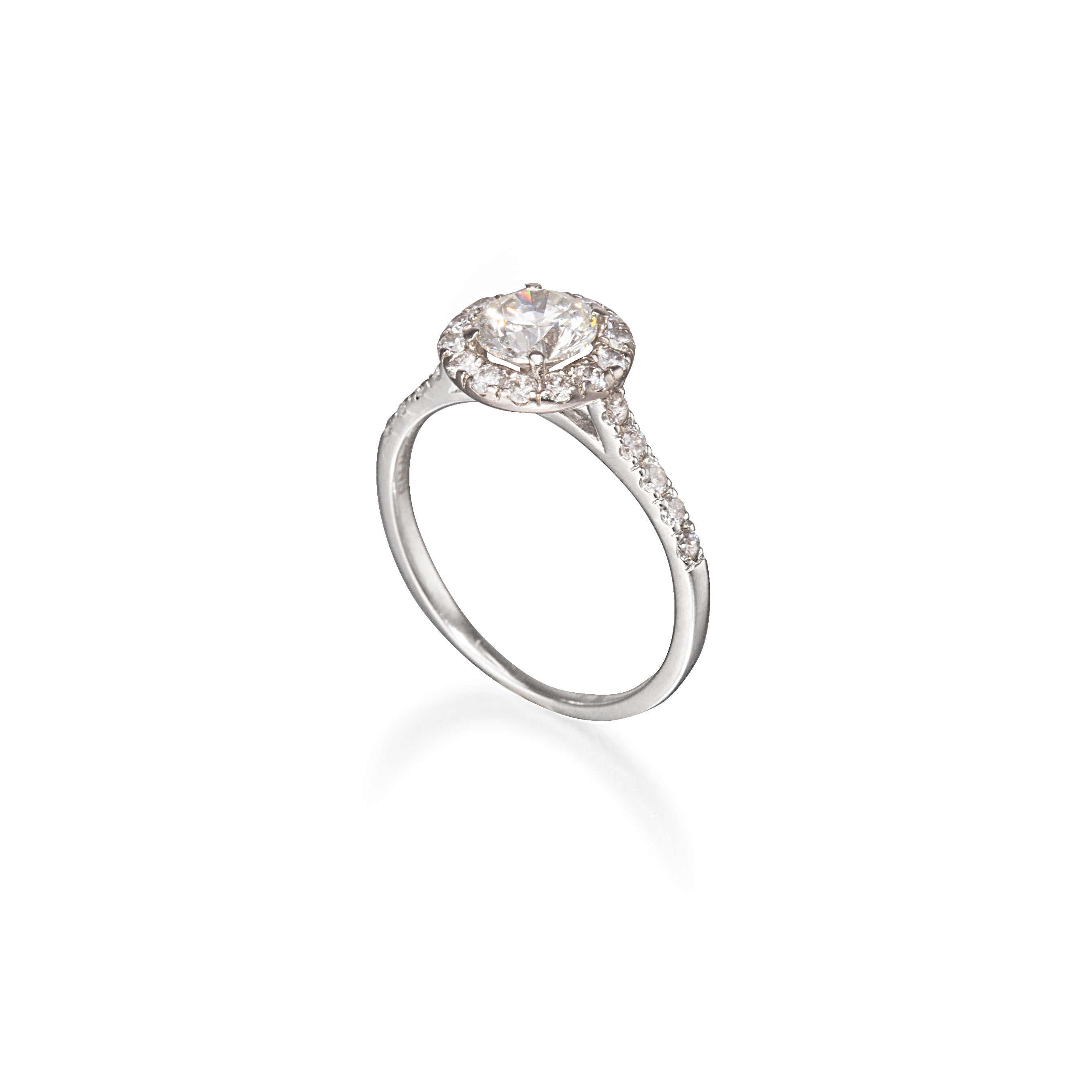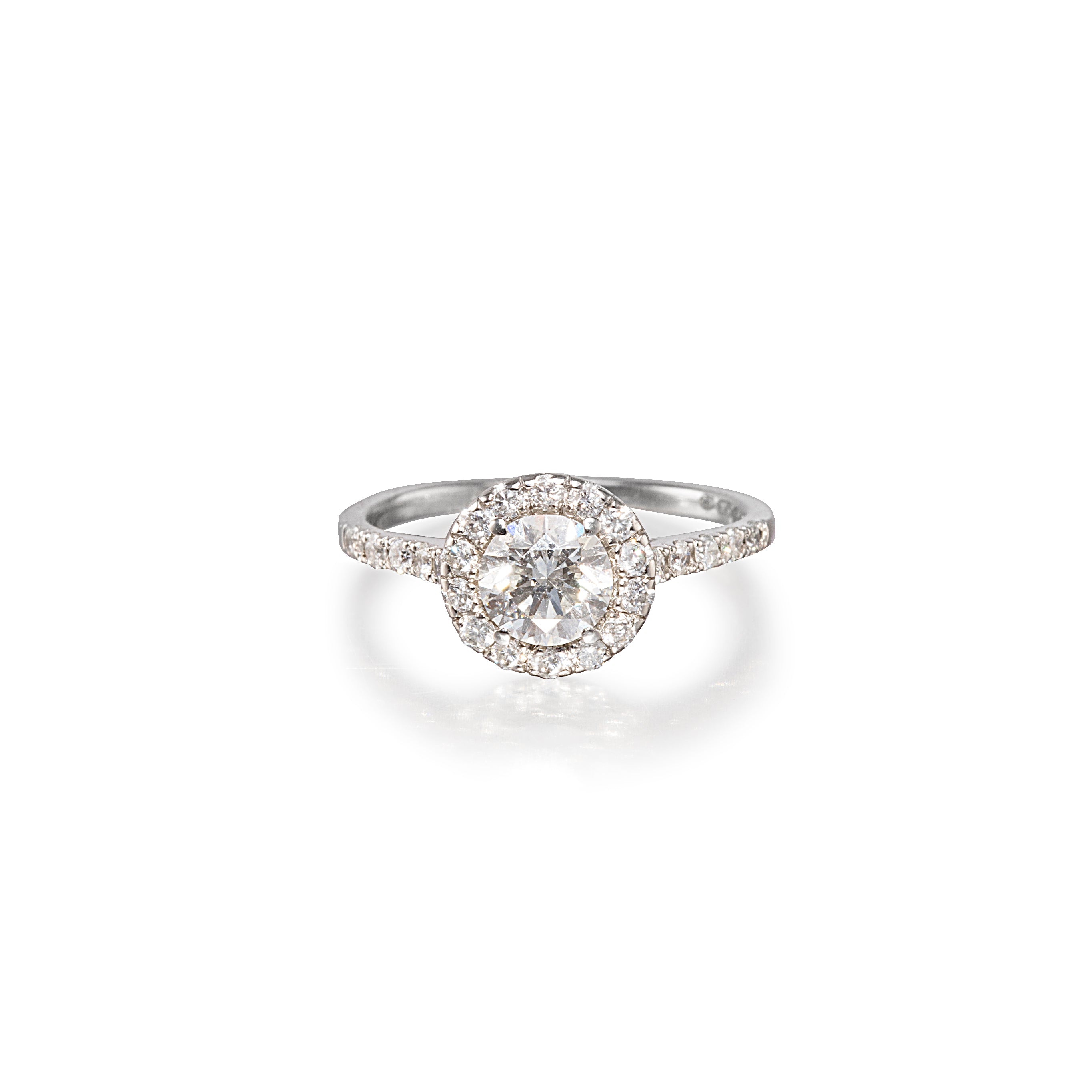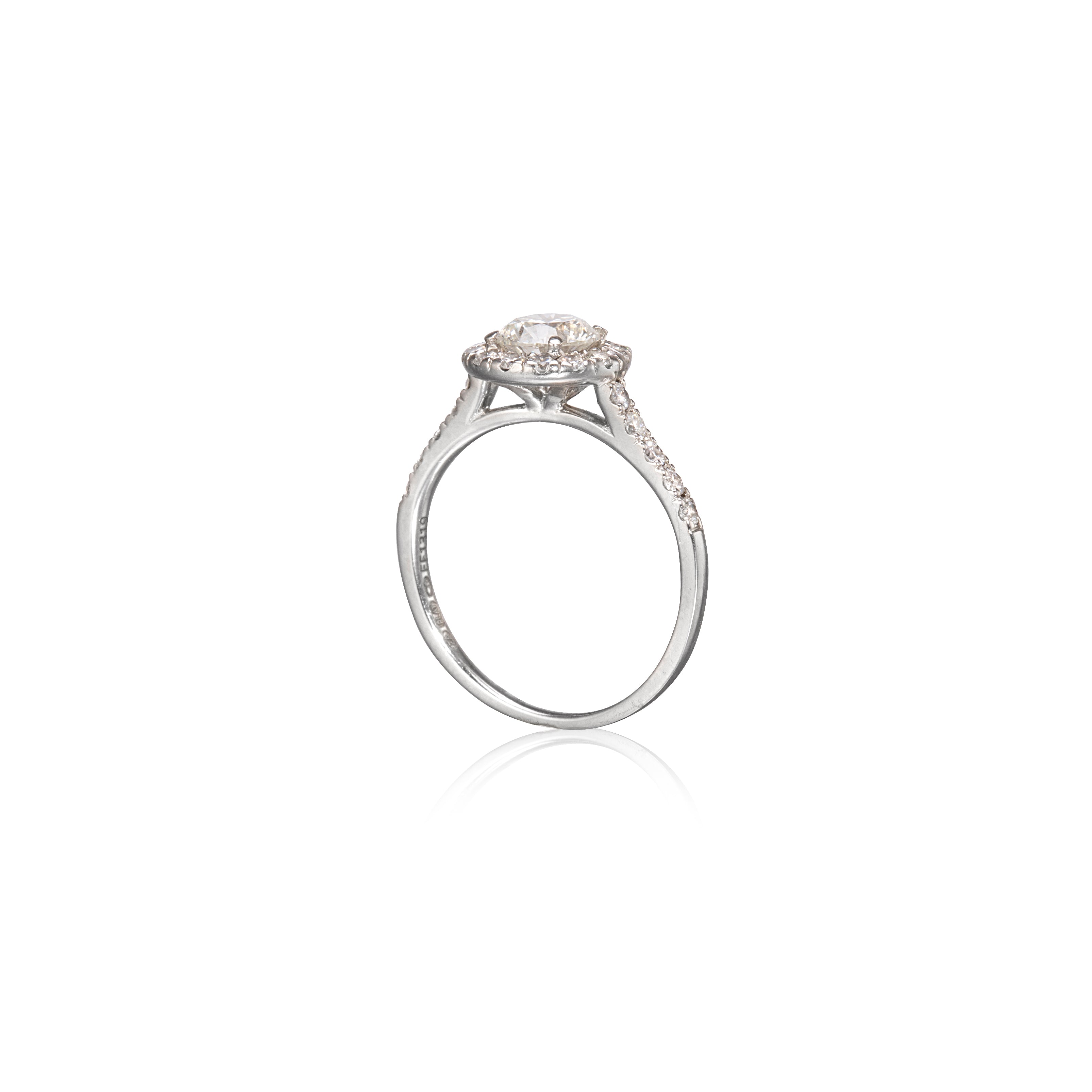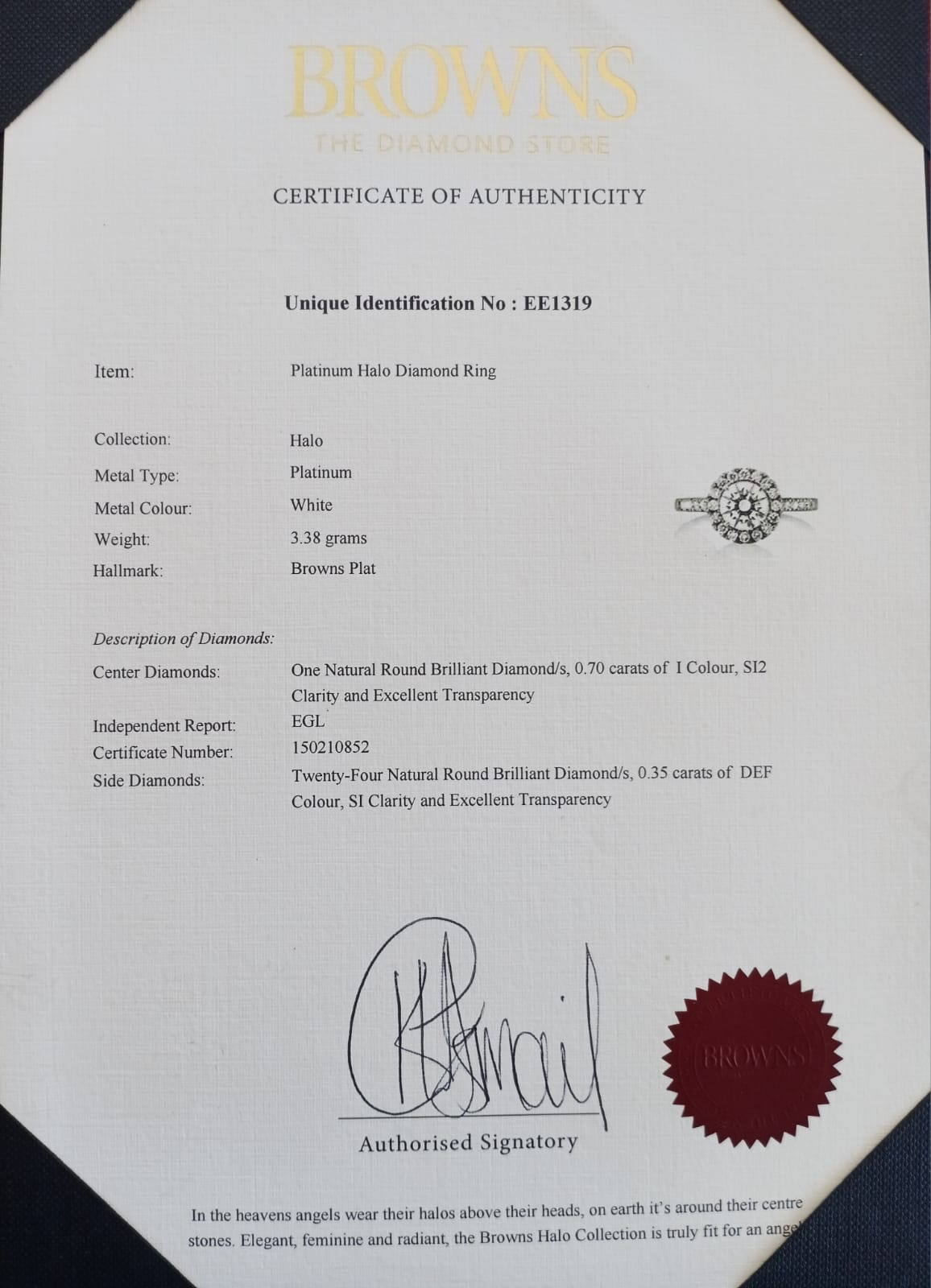 Browns Platinum Halo Diamond Ring set with: Center: 1 x Round Brilliant Cut Diamond of approx. 0.70cts I SI2 Halo: 14 x Round Brilliant Cut Diamonds each approx. 0.015cts DEF SI Sides: 10 x Round Brilliant Cut Diamonds each approx. 0.015cts DEF SI |